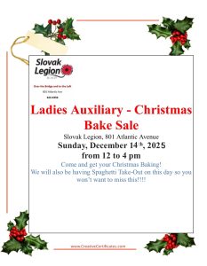 Slovak Legion Branch#129 Ladies Auxiliary Christmas Bake Sale Sunday December 14