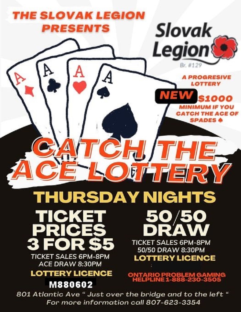 “Catch the Ace” was found at the Slovak Legion Thursday November 20. It will return in 2 weeks + once we have our NEW Licence. Thank you for your support and congratulations to our WINNER!!