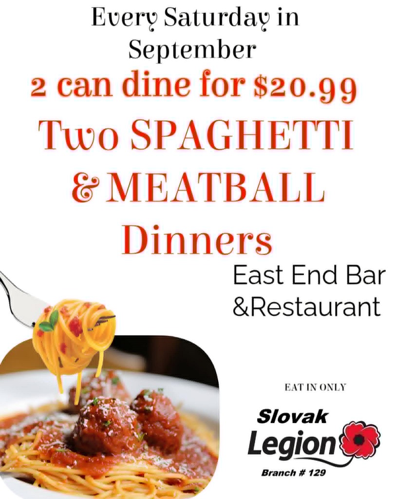Enjoy our Slovak Legion Bar Restaurant Special for this Saturday Sept. 6 from 5pm to 10pm.