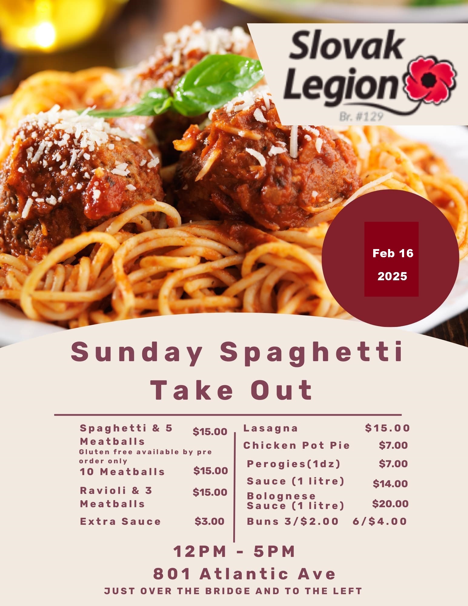 Slovak Legion Spaghetti Takeout Sunday February 16 12pm to 5pm. Hope to see you there. The Slovak Legion.