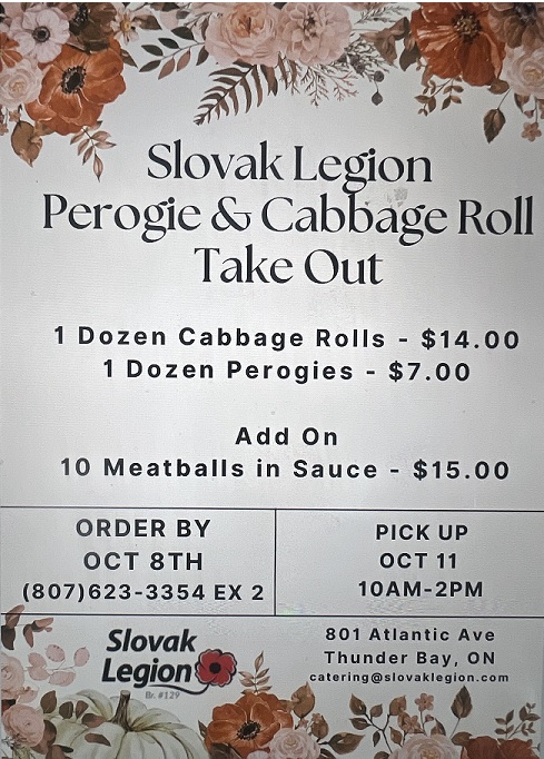 Thanksgiving Cabbage Roll and Perogie Orders are being taken by The Slovak Legion Branch 129. Perfect for Thanksgiving Celebrations or just great food to share. Meatballs are also available this year.